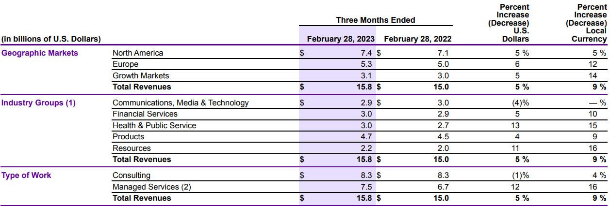 Accenture delivers professional services in five main segments, called Industry groups. The company has a fiscal year ending on August 31. Hence, below we will highlight the company's Q2 results of fiscal 2023 for the period ending on February 28.