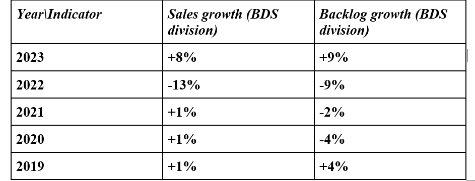 The BDS division marked the first backlog increase in 2023, following three years of declining Boeing government contracts backlog. Sales at BDS kept pace with the backlog increase, which has largely been the trend since 2019. Given the prevalence of fixed-price contracts in Boeing defense contracts, margins will only improve gradually at BDS.