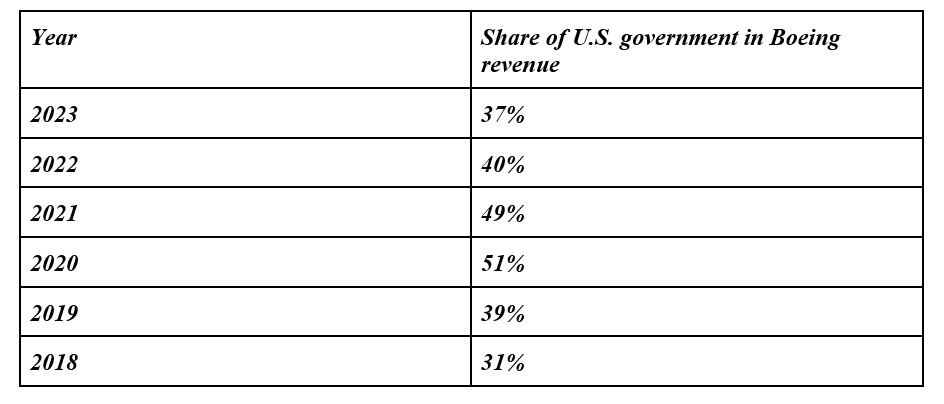 * 40% of Boeing revenue came from government sources in 2023;