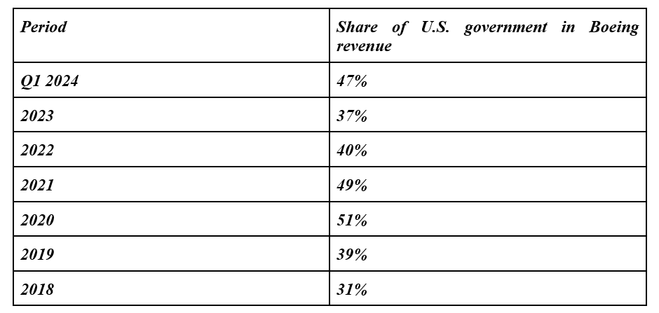 In Q1 2024, a combined 47% of Boeing revenue came from the U.S. government alone. Quarterly company disclosures are not detailed enough to conclusively compute the exact government exposure to non-U.S. sources.