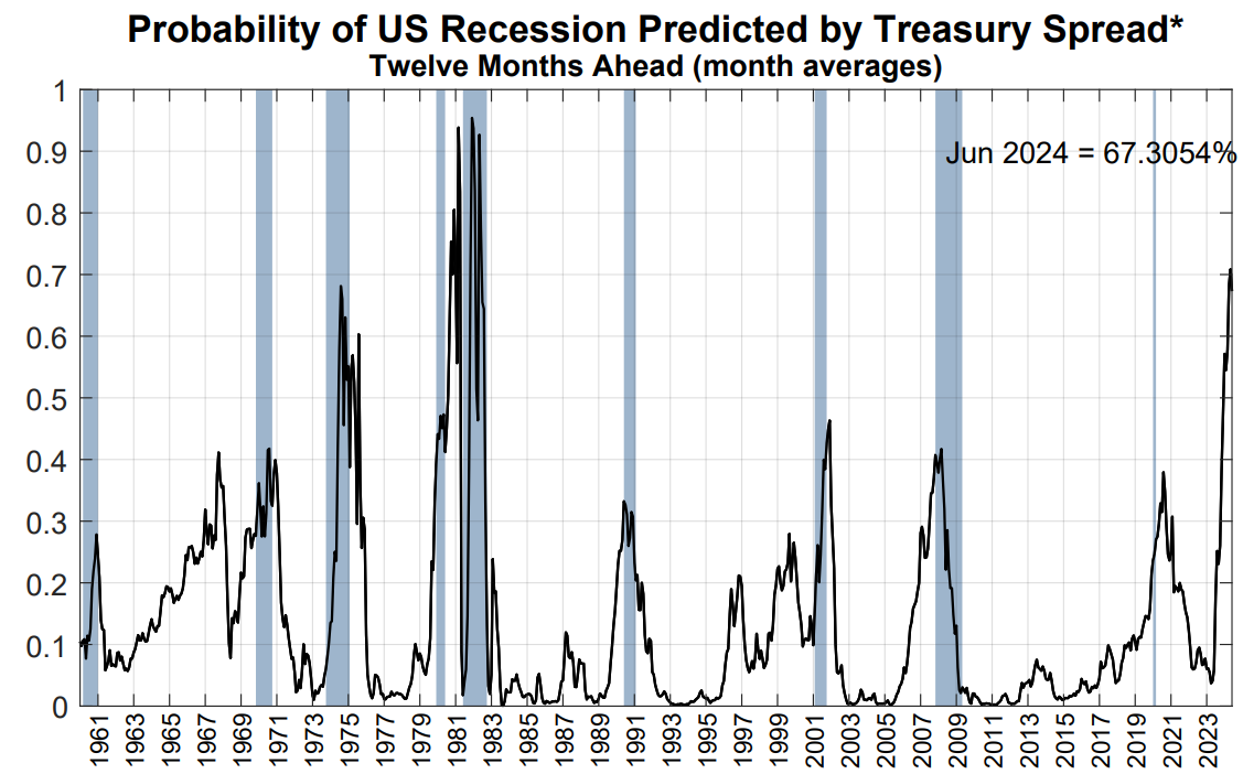 The Federal Reserve bank of New York publishes a recession probability indicator based on the difference between the 10-year and 3-month Treasury rates. The greater the inversion of the yield curve (i.e., 3-month rates are higher than 10-year rates), the greater the recession probability. The model currently prescribes a 67% recession probability in June 2024: