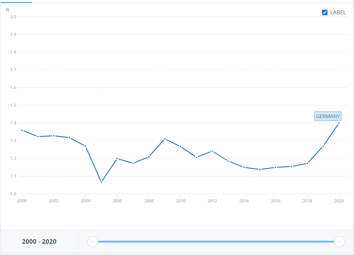 The graph below shows that not once has the country risen above 1.4% in any year between 2000 and 2020.