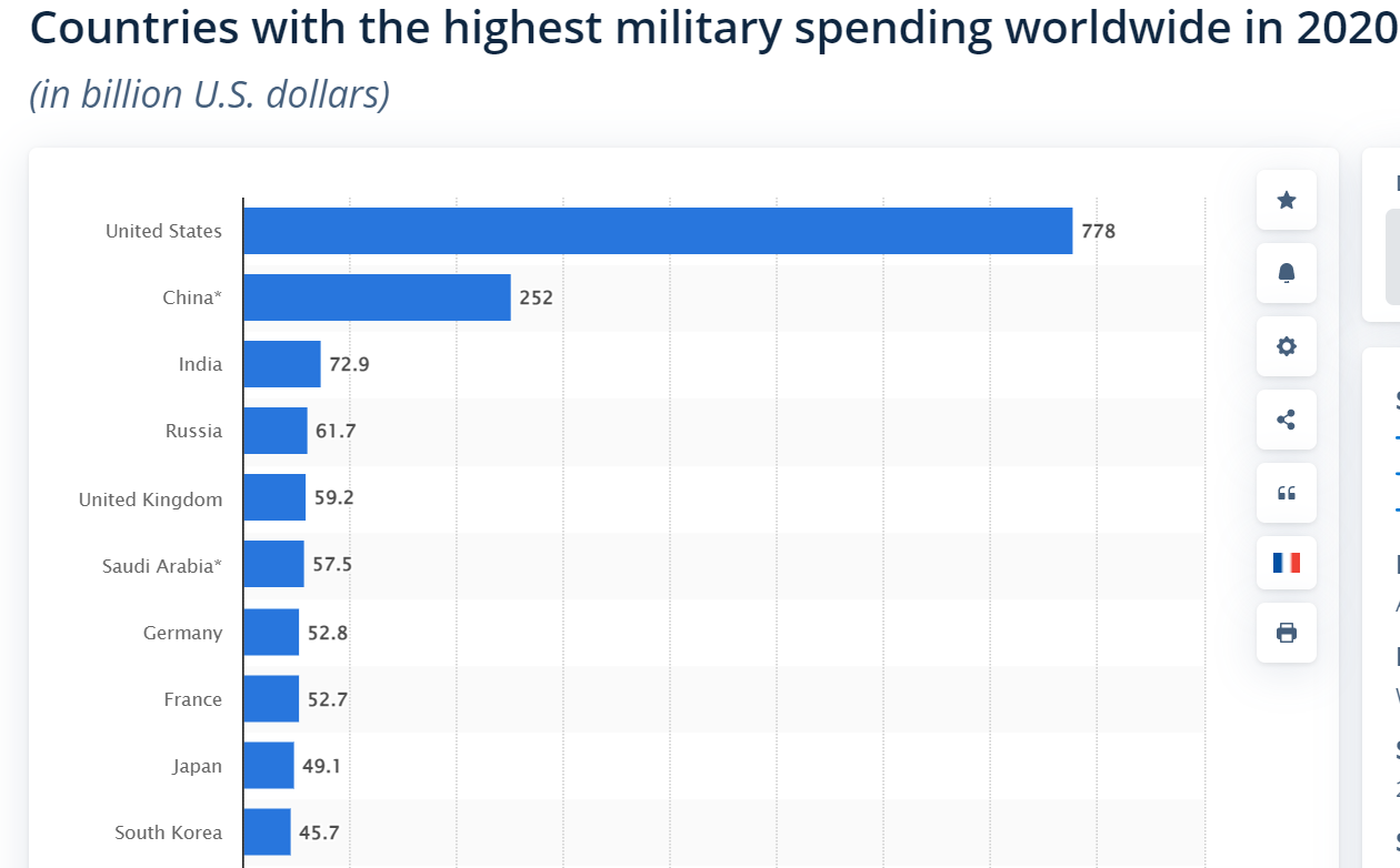 The realization of the proposal would represent the largest absolute jump in German military expenditure in recent history. Annual spending would increase by 50% in 2022 alone, making Germany one of the world’s largest military spenders – 3rd, after the US and China.