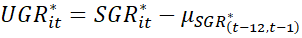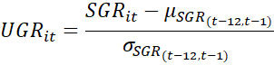 2. The "unexpected government receivables" (UGR) are the "normalized" scaled government receivables (SGR), where the normalization is done by subtracting the average SGR over the previous year (μ(SGR(t-12,t-1) )) and dividing by the standard deviation of SGR over the previous year (σSGR(t-12,t-1) ):