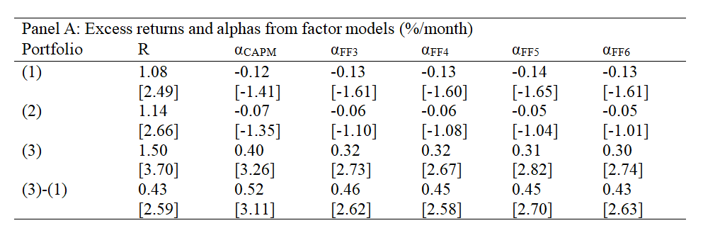 Stocks are value-weighted within portfolios and the portfolio holdings are rebalanced at the end of each month. T-statistics are reported in brackets. The sample includes all stocks in the Russell 1000 index and the period is from January 2013 – December 2020.