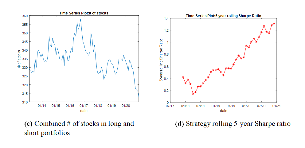 Given the UGR* signal, in each month the strategy takes positions in stocks with positive UGR* and shorts stocks with negative UGR*. Table 1 shows a backtest of this strategy executed within the Russell 1000 universe that includes results for 2020. The strategy takes short positions in about 200 stocks on an average month and long position in about 140 stock on average. The average returns and alphas range between 43 and 52 basis points per month, with t-statistics exceed 2.50 in all cases. Figure 1 shows that the strategy perform well throughout the entire sample, and its performance in 2020 is especially noteworthy.