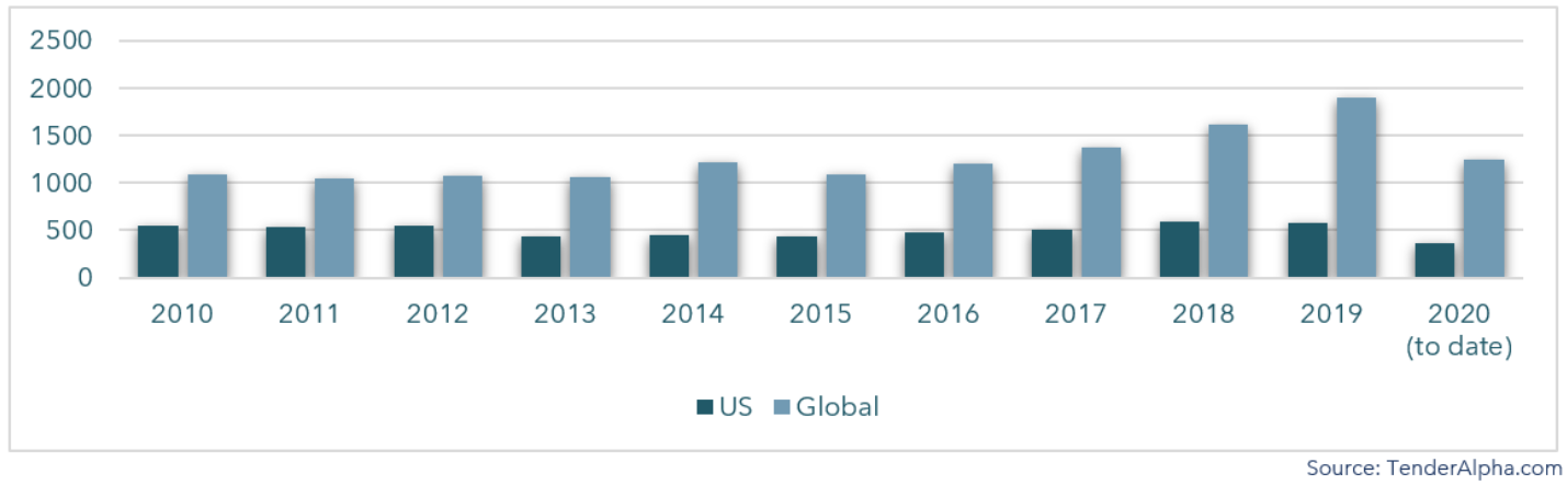 Figure 1. Global vs U.S. Federal Aggregate Contract Awards Value (2010-2020) (Bil.$)