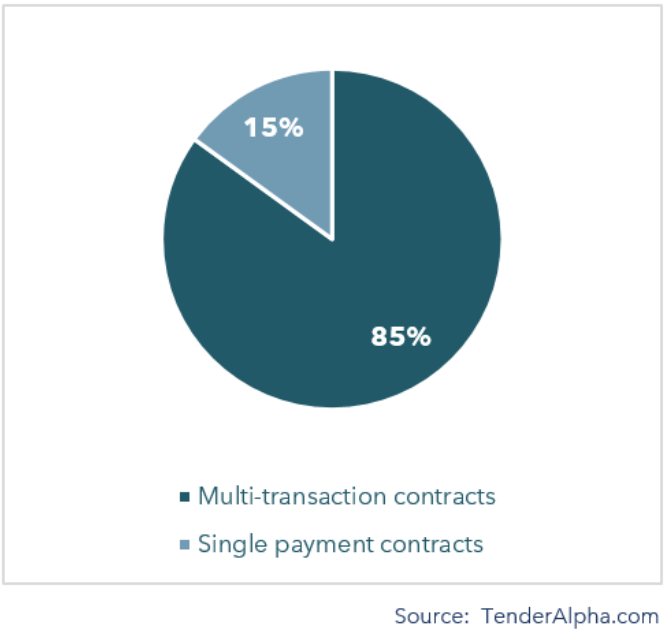 A study by TenderAlpha.com assumes that it is very costly for investors to process the information regarding government procurement contract awards sufficiently and quickly. While the biggest contracts catch the attention of media outlets, the vast majority of contract awards do not receive any press coverage. Furthermore, the U.S. federal procurement system allows very accurate forward-looking receivables projections as although smaller in number, multi-transaction contracts stand for nearly 90% of the total USD value of the federal awards made annually (Figure 2 and 3) or nearly USD 5 trillion from 2010 to today. Closely monitoring the public information on the entire payment cycle of each U.S. federal contracting enables accurate forward-looking projection on receivables from government contracting. The forward-looking receivables data is available per ticker.