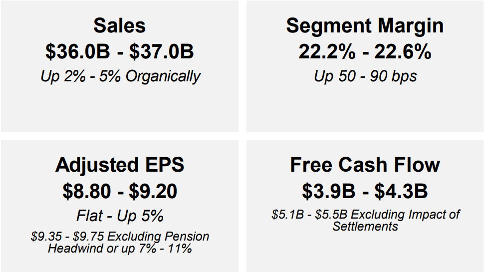 Free cash flow will take a hit from a $1.2 billion net payment for legacy asbestos liabilities settlement. Thus, free cash flow is expected to decrease by about 16.3% to $3.9-4.3 billion.