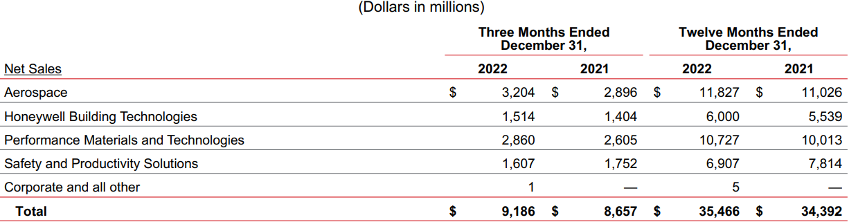 Honeywell reports results in four main segments, namely Aerospace at 34.9% of Q4 2022 revenues, Honeywell Building Technologies at 16.5% of Q4 2022 revenues, Performance Materials and Technologies at 31.1% of Q4 2022 revenues and Safety and Productivity Solutions at 17.5% of Q4 2022 revenues: