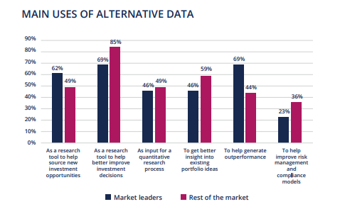 In it, 100 hedge fund managers, managing a total of about USD 720 billions in assets, responded. 53% of them were alt data users. The study then divided the users of alternative data among the participating hedge funds into ‘market leaders’ and ‘rest of the market’.