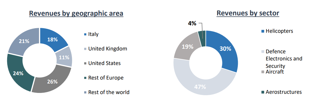 Leonardo reports results in four main sectors, namely Defense Electronics & Security at 47% of 2023 revenue, Helicopters at 30%, Aircraft at 19%, and Aerostructures at 4% of 2023 revenues: