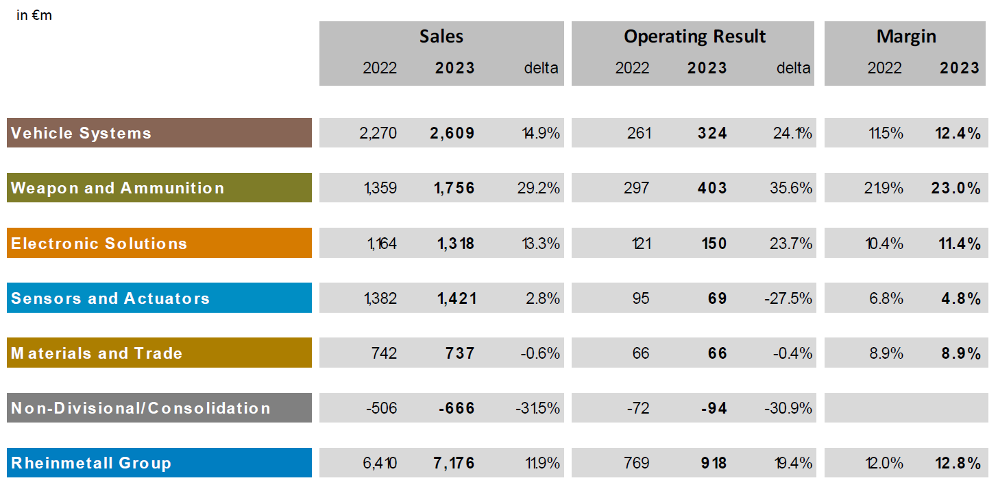 Rheinmetall reports results in five main segments, namely Vehicle Systems at 33% of 2023 sales, Weapon and Ammunition at 22%, Electronic Solutions at 17%, Sensors and Actuators at 18%, and Materials and Trade at 10% of 2023 sales: