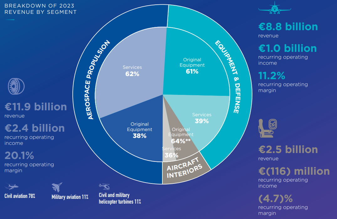 Safran reports results in three key segments, namely Aerospace Propulsion at 51% of 2023 revenues, Equipment & Defense at 38%, and Aircraft Interiors at 11% of 2023 revenue: