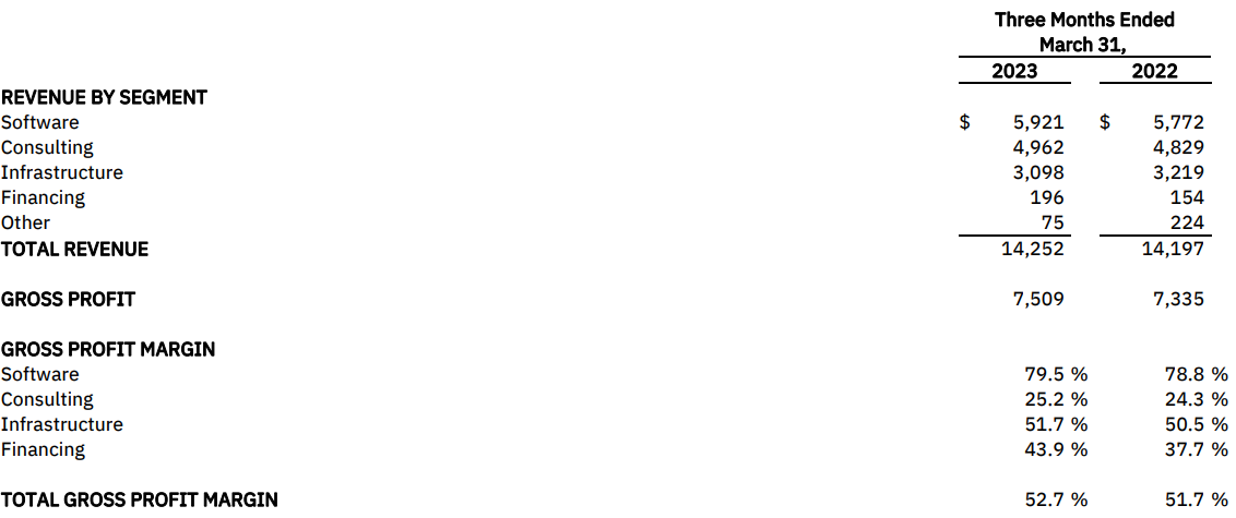 IBM reports results in three main segments, namely Software (includes Hybrid Platform & Solutions, Transaction Processing) at 41.5% of Q1 2023 revenues, Consulting (includes Business Transformation, Technology Consulting and Application Operations) at 34.8% and Infrastructure (includes Hybrid Infrastructure and Infrastructure Support) at 21.7% of Q1 2023 revenues: