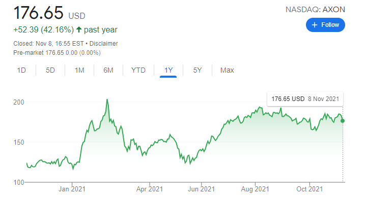 While the remainder of the first half of 2021 proved to be difficult for the entire market, Axon included, the company managed to show resilience. It saw its stock price rise again to USD 176.65 on 8 November, up from USD 126.25 on 13 May.