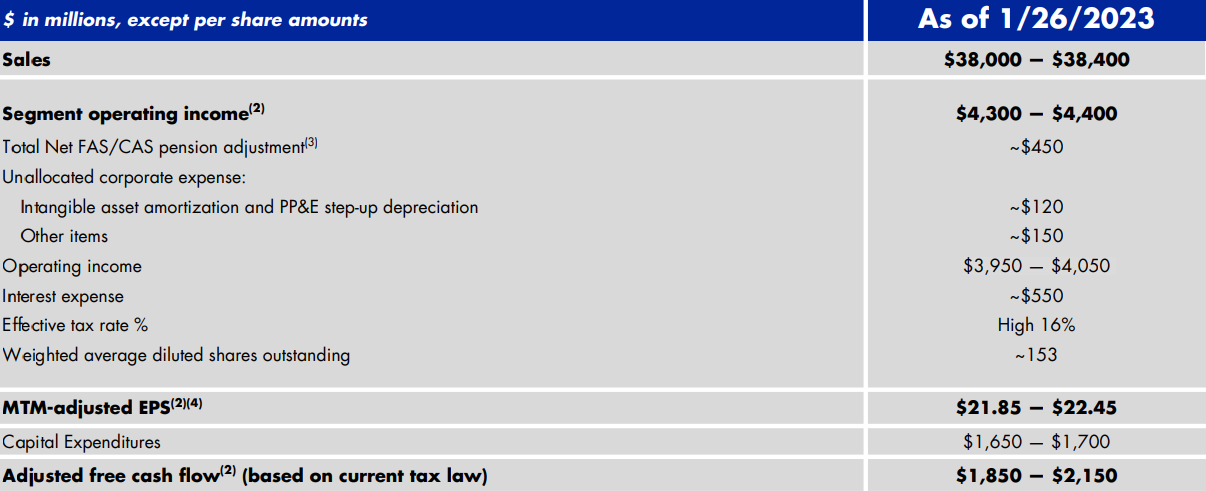 * 4.4% revenue growth projected for 2023 to $38.2 billion, driven by Space Systems and Mission Systems. Operating margin seen down 20 basis points (2022 – 11.6%);