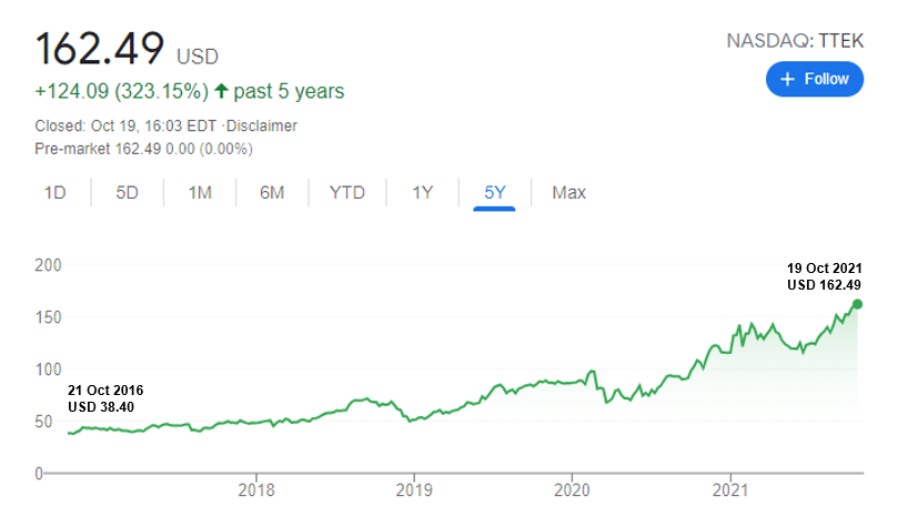 Figure 1: Tetra Tech stock price movement 21 Oct 2016 – 19 Oct 2021