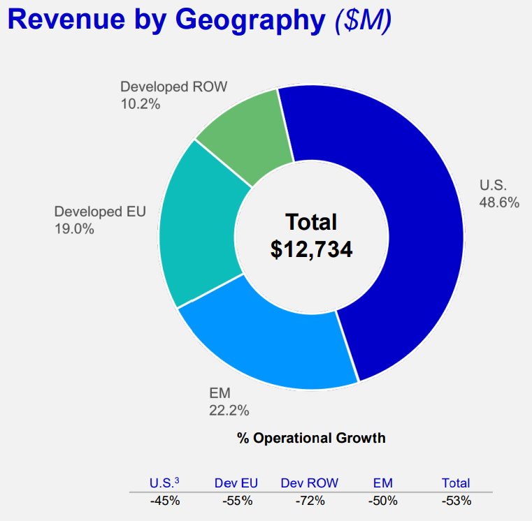 From a geographical perspective, the U.S. is the largest market at 48.6% of Q2 2023 revenues, followed by emerging markets at 22.2%: