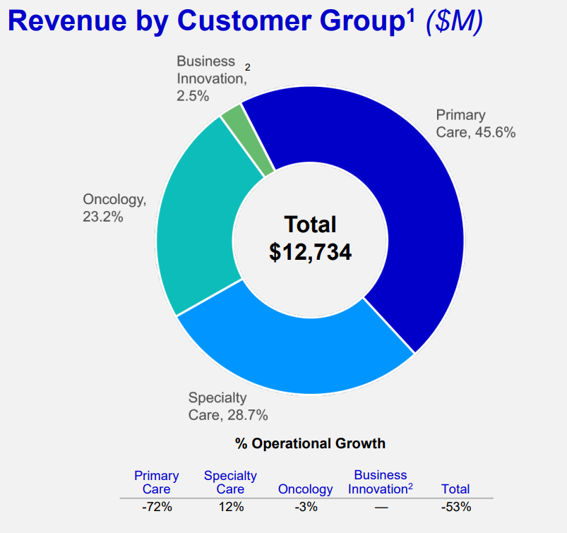 Pfizer reports results in three customer groups, namely Primary Care (Internal Medicine and Vaccines, COVID-19 treatments) at 45.6% of Q2 2023 revenues, Specialty Care (Inflammation & Immunology, Rare Disease and Hospital) at 28.7% revenues and Oncology at 23.2% at of Q2 2023 revenues: