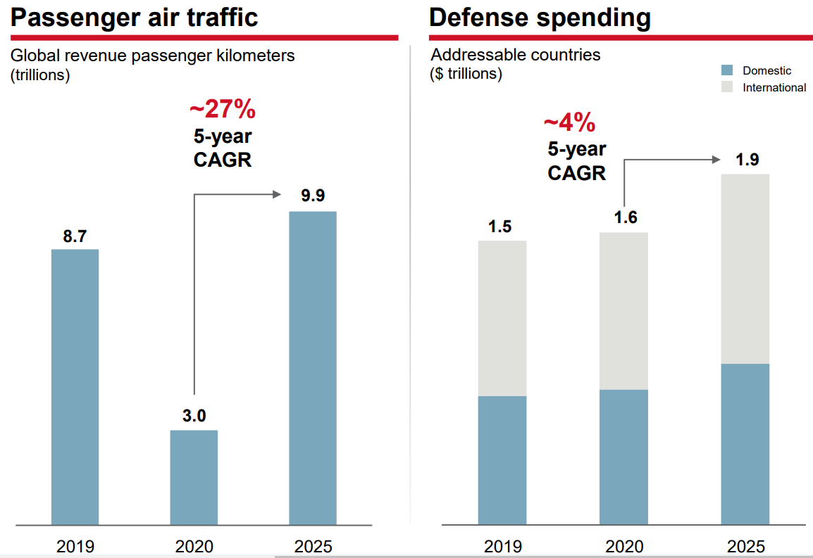 * Global revenue kilometers currently at 95% of 2019 levels; expected to reach 114% by 2025. Defense budgets seen 27% higher in 2025 relative to 2019.
