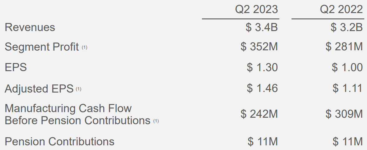 Adjusted Earnings per share grew 31.5% Y/Y in Q2 to $1.46/share. Cash conversion was weaker however, with manufacturing cash flow before pension contribution down 21.7% Y/Y to $242 million in Q2 (2022 $1,178 million).