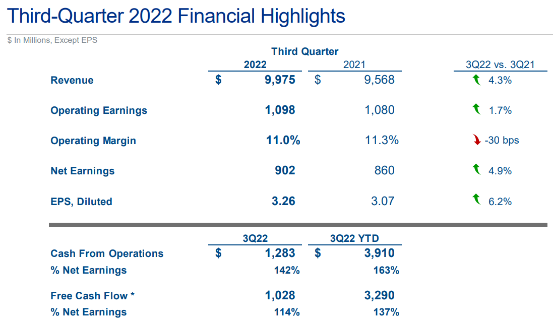 The company continued to generate strong free cash flow, at 114% of net earnings in Q3, and is on track to deliver a free cash flow conversion at or above 100% of net income for 2022, despite no action from legislators on the treatment of research & development expenses. Perhaps the current treatment of R&D expenses, namely to capitalize and depreciate them over time, will change in 2023 in favor of outright expensing.