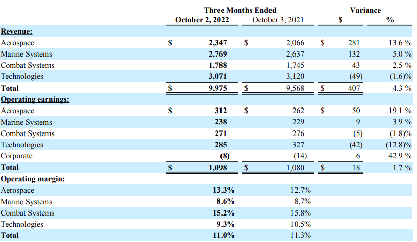 General Dynamics reports results in four main segments, namely Aerospace at 23.5% of Q3 2022 revenues, Marine Systems at 27.8%, Combat Systems at 17.9%, and Technologies at 30.8%: