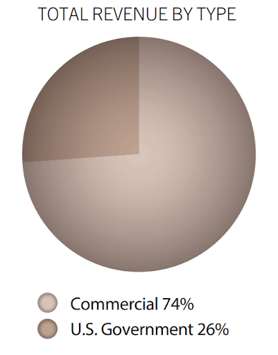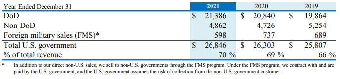 Among defense manufacturers, Textron has a relatively large commercial exposure, with 74% of 2021 sales coming from business customers, and 26% U.S. government exposure: