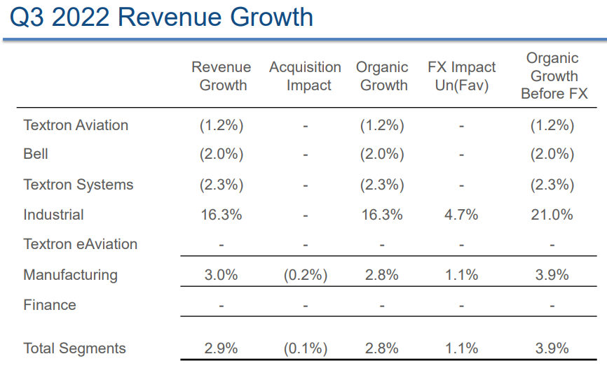 Textron reports results in four main manufacturing segments, namely Textron Aviation at 37.9% of Q3 2022 revenues, Industrial at 27.6% of Q3 2022 revenues, Bell at 24.5% of Q3 2022 revenues and Textron Systems at 9.5% of Q3 2022 revenues.