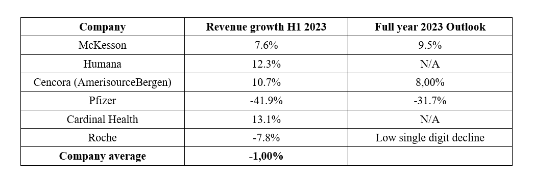 - Pharmaceutical distributors (McKesson, Cencora and Cardinal Health) reported revenue growth of 10.5% in H1 2023, driven by growth in core distribution businesses and healthcare services.